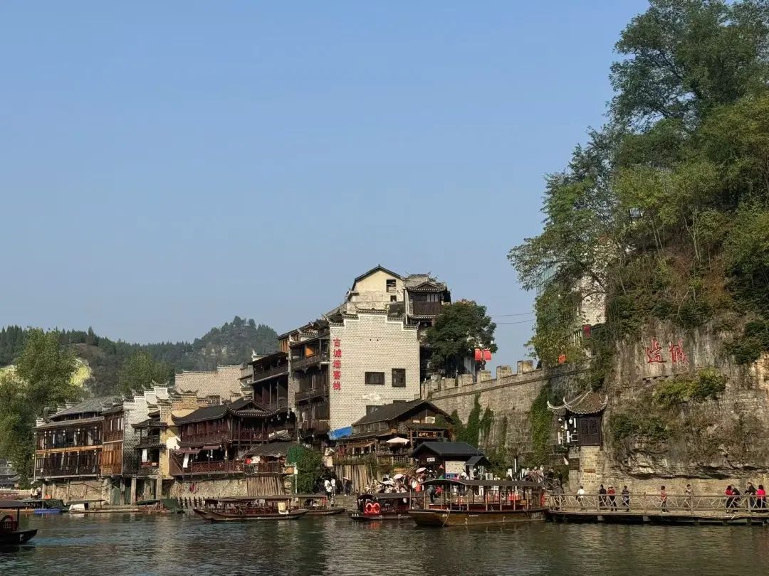 夜幕降臨,我們抵達(dá)鳳凰古城。這里是沈從文筆下的邊城,燈火闌珊中,古城河邊的吊腳樓倒映在水中,美得不似人間。漫步石板小徑,每一步都踏著歷史的回響,夜晚的鳳凰,更添了幾分神秘與浪漫。